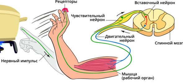 В случае с рефлексом отдёргивания руки, рецепторы (датчики температуры) преобразуют тепловой сигнал в электрический импульс, который затем идёт по отросткам нейрона подобно току по проводам, достигая спинного мозга, где сигнал переключается на двигательный нейрон. От последнего информация в виде импульса устремляется в мышцу, которая сокращается и ты убираешь руку. Всё это происходит очень быстро, что даже не успеваешь подумать.