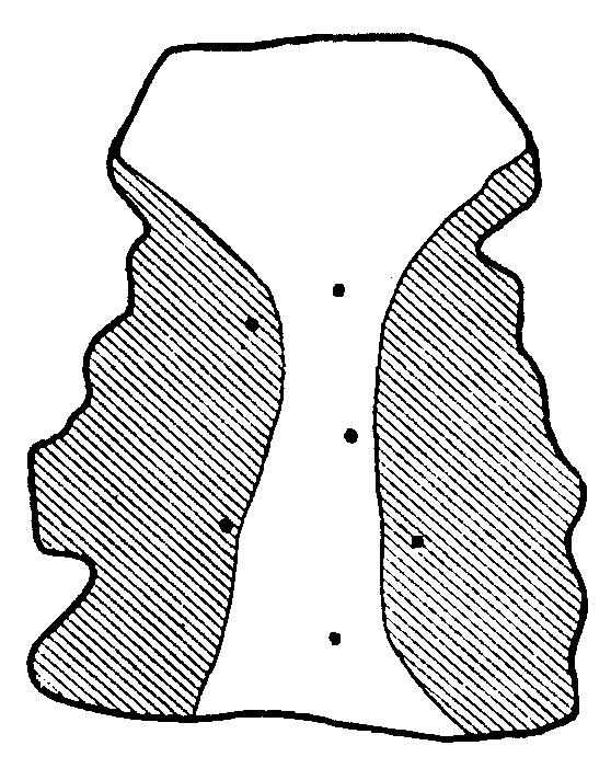 [Закрыть]. Для этого надо иметь изготовленное в зубопротезной мастерской искусственное небо из тонкой целлулоидной пластинки или из другого тонкого материала (специально каждый раз по форме неба данного испытуемого) с несколькими дырочками для удобства последующих обмеров. Перед опытом поверхность искусственного неба покрывается тальком или пудрой, что в момент артикуляции частично стирается прикосновением языка, этот результат или переносится на специальную карточку, или прямо фотографируется, чтобы потом производить любые обмеры (см. рис. 6, перерисовка искусственного неба).
