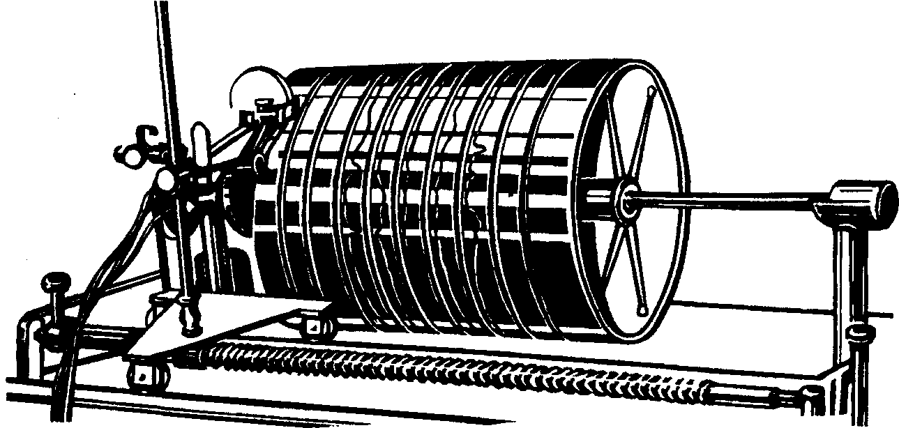 Барабан кимографа можно приводить в движение разными способами: грузом, часовым заводом и, наконец, электромотором, что является самым совершенным.