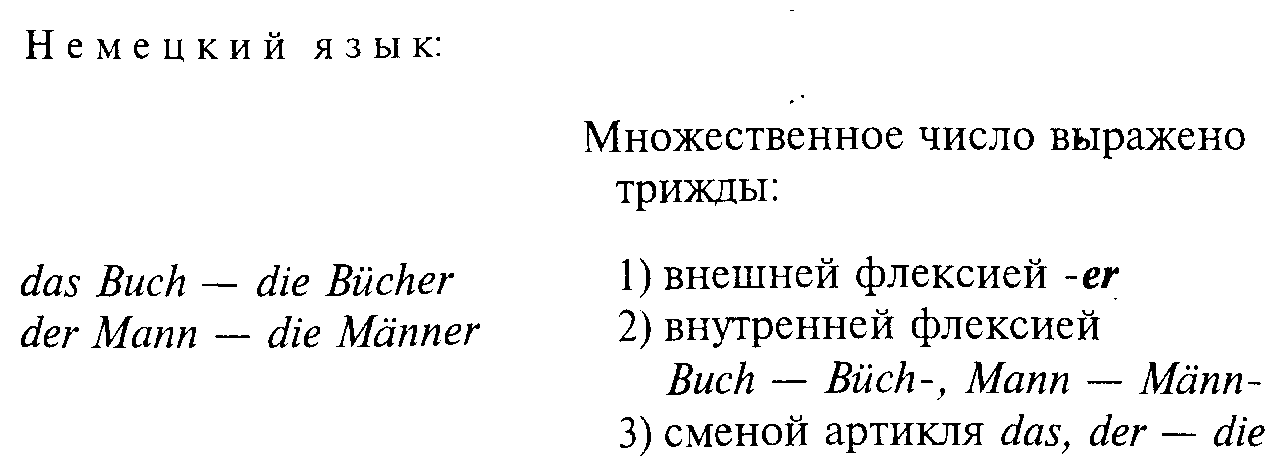 Даже если сравнить образование тех же форм множественного числа в близкородственных языках, как немецкий и английский (в тех же по происхождению словах Buch, book – «книга» и Мапп, man – «человек»), видна будет тенденция синтетическая (в параллельном повторении грамматического значения) и аналитическая (в желании только один раз выразить данное грамматическое значение):