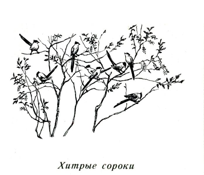 Однажды на закате, собравшись в стаю, сороки, как обычно, слетелись к нашей поляне. Ягод на кустах оставалось уже немного, и птицы особенно горячо спорили, треща без умолку и раскачиваясь на гибких ветках.