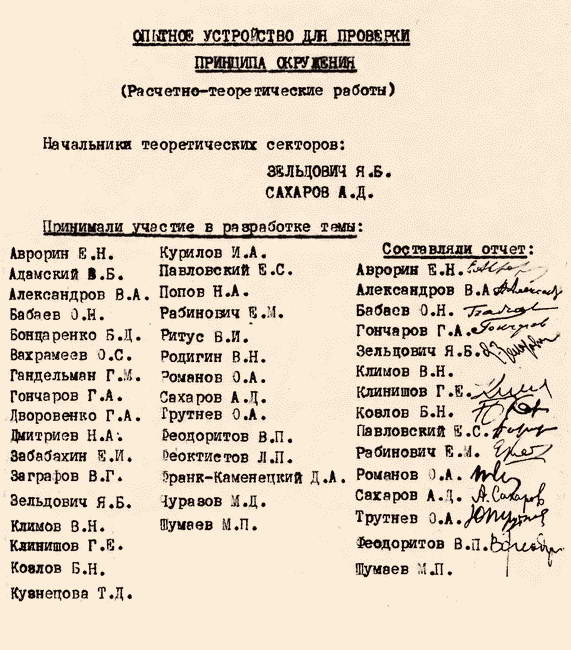 «Руководители: 1) Е.И. Забабахин, 2) Я.Б. Зельдович, 3) Ю.А. Романов, 4) А.Д. Сахаров, 5) Д.А. Франк-Каменецкий.