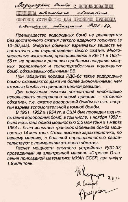 7 октября 1955 г. Ю.Б. Харитон, А.Д. Сахаров, Я.Б. Зельдович выпустили отчет «Водородные бомбы с использованием принципа атомного обжатия. Опытное устройство для проверки принципа» /7, с. 397/.