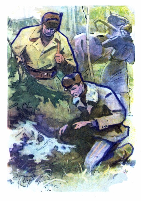 До знакомой просеки доехали быстро. От снега не осталось и следа. Я думал, что это затруднит поиски, но Лайвинь вел нас уверенно. Прошли редколесье, миновали заросли молодого сосняка и вступили в густой еловый лес. Тут Лайвинь, уступая мне дорогу, шагнул в сторону и сказал: