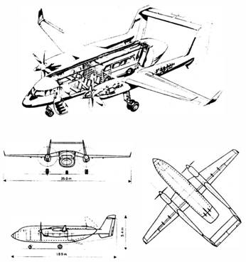 Другой особенностью машины должен стать фюзеляж с эллиптической формой поперечного сечения. Подобная идея в авиации не нова. Еще в 1940 году пытался ее реализовать авиационный конструктор Р.Л. Бартини в проекге самолета Т-1 17, но до сих пор по различным причинам это сделать не удалось. Подобная компоновка фюзеляжа, помимо высокой плотности, позволит несколько поднять и аэродинамическое качество, что особенно важно для полетов на большие расстояния. Этот последний фактор и учтен в проекте.