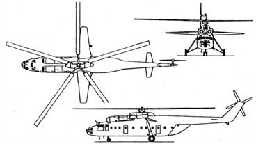 – на внешней подвеске 9000 Число пассажиров, чел. 65 Максимальная скорость, км/час 300 Крейсерская скорость, км/час 250 Скороподъемность, м/сек 6,5 Дальность полета, км 620-970 Максимальная продолжительность полета, час 3 Динамический потолок, м 4500 Статический потолок, м 2250 Диаметр несущего винта, м 35 Диаметр рулевого винта, м 6,3 Общая длина вертолета, м 41,74 Длина фюзеляжа, м 33,7 Высота вертолета, м 9,15 Размах крыла, м 15,3 Экипаж, чел. 5