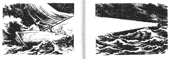 Схватив кормовое весло, старик, выгребая изо всех сил, старался увеличить ход судна. Но держать бот против ветра, работая веслом, было не под силу даже ему.