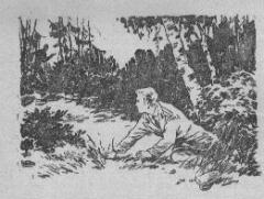 Данченко захватил азарт погони. Он бежал, перепрыгивая через корневища, не разбирая дороги; ветки больно хлестали его по лицу, царапали руки. На мгновение остановившись, он вслушивался в топот ног, хруст сучьев и, определив направление, бежал вновь. Лесная чаща становилась все глуше, здесь было влажно и сумеречно; ноги по щиколотку уходили в торфяник, скользили на кочках. Напрягая силы, он бежал все быстрее. Вдруг яркий солнечный свет ударил в глаза. Тяжело дыша, Данченко прислонился к стволу березы. По ту сторону просеки мелькнула тень и снова скрылась в лесу. Их отделяло полсотни метров. Данченко бросился вперед, но, поскользнувшись, упал, услышав в то же мгновение свист пули.