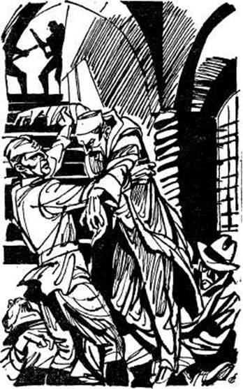 Фокусник, как куль, упал на кушетку, из-за двери выскочило трое подслушивавших и кинулись на сержанта.