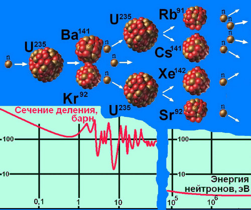 В ядерной физике оказалась весьма плодотворной модель «жидкой капли», в соответствии с которой действие внутриядерных сил приводит к явлению, напоминающему поверхностное натяжение. Возбужденное попаданием нейтрона в U235 компаунд-ядро U236 не разваливается сразу, в нем сначала образуется перетяжка (верхний рисунок), а затем происходит деление на осколки, как правило, неравной массы. Процесс этот – вероятностный, а пример показывает, что делящаяся в первом поколении, растянувшаяся «капля» вот-вот распадется на ядра бария и криптона. Из образовавшихся после распада трех мгновенных нейтронов деления один (в центре) «промахнулся», а два других – положили начало второму поколению, с образованием пар цезия и рубидия, ксенона и стронция. На графике – сечения реакции деления U235 на нейтронах разных энергий. Вероятность того, что медленный нейтрон вызовет деление, на порядки превышает ту же вероятность для быстрого нейтрона