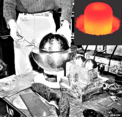 Слева: приспособления для отливки заготовки заряда из плутония. Правее: так обращался с содержащей плутоний сборкой доктор Слотин (фотография взята из отчета комиссии, расследовавшей одну из первых в истории ядерных аварий). Снимок справа вверху дает представление о такой аварии. Сфотографирован образец плутония, правда, не оружейного, как в опыте Слотина, а изотопа с массовым числом 238. Различия в ядерных свойствах «плутониев» даже более велики, чем «уранов»: в Pu238 не может возникнуть цепная реакция деления, но другие самопроизвольные ядерные реакции протекают столь интенсивно, что металлический Pu238 всегда пребывает в раскаленном состоянии; оружейный Pu239 сравнительно малоактивен (хотя его температура и превышает комнатную на несколько градусов), зато – способен к цепной реакции, которая при определенных условиях может быть взрывной. В опыте Слотина она такой не стала, но Pu239 раскалился, став на несколько секунд похожим внешне на Pu238. Еще один «беспокойный» изотоп – Pu240 – испускает нейтроны спонтанно и на четыре порядка более интенсивно, чем «оружейный» собрат. Высокий «примесный» нейтронный фон не позволяет применять полученный в реакторе плутоний в зарядах ствольного типа (об этом – в конце главы)
