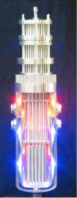 Ядерные реакции, продуктом которых является Pu239, в основном заканчиваются через несколько недель после извлечения отработавших ТВЭЛов. Это время они выдерживаются в бассейнах с водой, а их гамма-излучение столь интенсивно, что возбуждает вторичное (черенковское) излучение синеватого цвета в водяной защите (справа). В «отсветивших» ТВЭЛах остается плутоний, который отличается от урана валентностью, что делает возможным его выделение химическими методами.