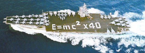 Выделение энергии при ядерной реакции происходит за счет массы: суммарная масса продуктов реакций меньше, чем ядер, в реакцию вступающих. Офицеры и матросы авианосца «Энтерпрайз» (нижний снимок) выстроилась на полетной палубе, образовав формулу Эйнштейна, связывающую убыль массы («т») реагентов при делении уранового топлива и выделяющуюся при этом энергию («Е»), которой ядерные реакторы обеспечивают их корабль («с» – скорость света). Цифра «40» означает, что все сорок лет службы корабля доказывают справедливость этой формулы. Перезарядка активных зон ядерной энергетической установки авианосца производится раз в три года и обеспечивает дальность плавания более чем в 300000 миль. «Энтерпрайз» вошел в состав ВМС США в 1961 г. и останется в строю до 2013 г. Полное водоизмещение авианосца – 93400 т