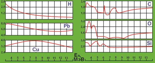 Сечения взаимодействия некоторых ядер с быстрыми (МэВ-ных энергий) нейтронами. На ординатах каждого графика даны сечения в барнах. Для низко-энергетичных нейтронов различия еще более заметны и характеризуются резонансами – скачками сечений (иногда – в пределах более трех порядков).