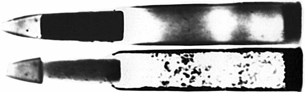 Нейтронограммы патрона, полученные на нейтронах разных энергий (при задержке запуска электронно-оптического преобразователя относительно нейтронного импульса и без нее). На верхней нейтронограмме, полученной без задержки запуска (на быстрых нейтронах), – различимы только металлические детали. Медленные нейтроны дают возможность обнаружить и заряд пороха, состоящего их «легких» элементов (азота, углерода, водорода, кислорода)