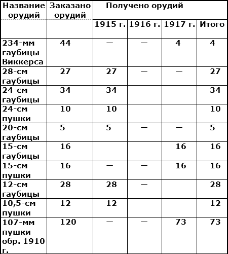 Россия в 1915–1917 гг. закупила в Японии следующие орудия: