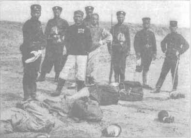 Японские интервенты у трупов расстрелянных ими рабочих-железнодорожников. Дальний Восток. 1920 г.