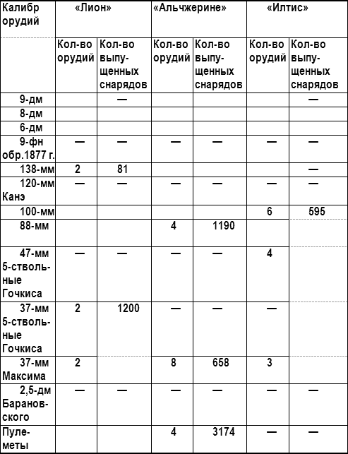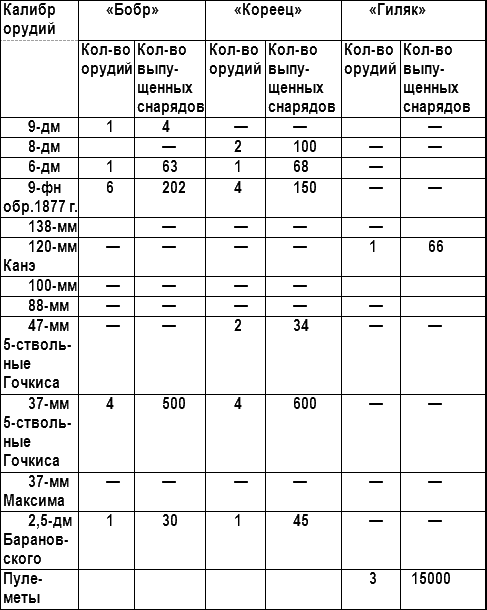Потери экипажей канонерских лодок составили: «Кореец» – убит лейтенант Бураков, смертельно ранен лейтенант Деднев; нижних чинов – убиты 8, ранены 21. «Гиляк» – ранены лейтенанты Титов и Богданов; нижних чинов – убиты 8, ранены 45. «Лион» – ранено три нижние чина. «Илтис» – один офицер убит, командир смертельно ранен; нижних чинов – убиты 4, ранены 14. «Альчжерине» – 2 офицера ранены; нижних чинов – ранены 7 человек.