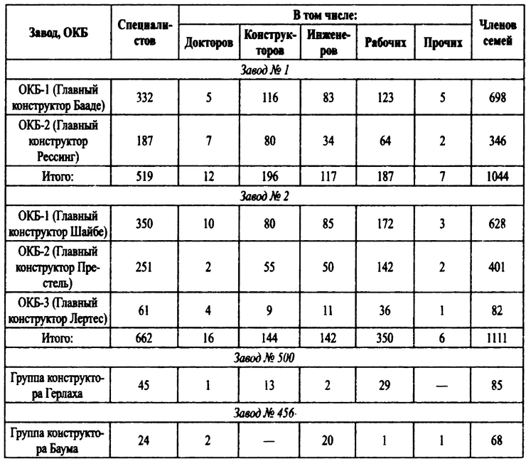 Директором завода № 1 был назначен генерал В.И. Абрамов, главным конструктором – немец Брунольф Бааде. Советским дублером главного конструктора стал С.М. Алексеев. Кроме немцев на опытном заводе № 1 работало около полутора тысяч русских, в подавляющем большинстве рабочих.