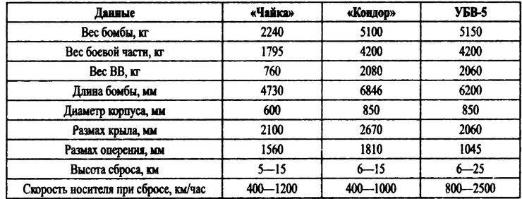 В процессе всего наведения бомбы на цель самолет-носитель не должен был менять курс и скорость, что было крайне неудобно при открытии огня зенитной артиллерией и при атаке истребителей. По проекту носителем «Чайки» должен был быть реактивный бомбардировщик Ил-28, а «Кондора» – реактивный бомбардировщик Ту-16, но испытания их проводились за неимением Ту-16 на Ту-4 и Ил-28.