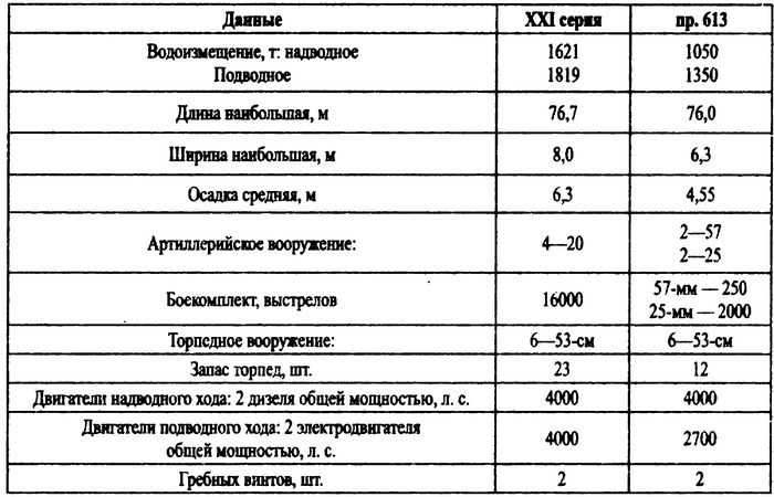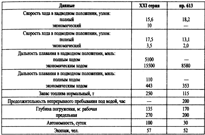 Сравнительные данные германских подводных лодок XXI серии и их советского аналога – подводной лодки пр. 613