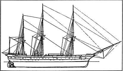 Следующим после клиперов классом крейсерских судов были корветы. Корветы – трехмачтовые суда с фрегатным парусным вооружением. Основное отличие от фрегатов – меньшие размеры и расположение артиллерии. В середине XIX века артиллерия фрегатов располагалась как на палубе, так и на закрытой батарее, а корветов – только на палубе.