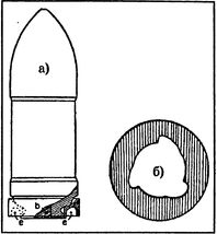 а – устройство снаряда системы Блэкли, б – сечение канала пушки Блэкли