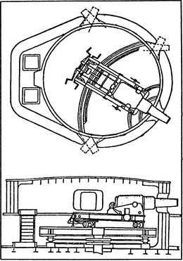 Неподвижная броневая башня на броненосце «Хотспур» (план и сечение по диаметральной плоскости)