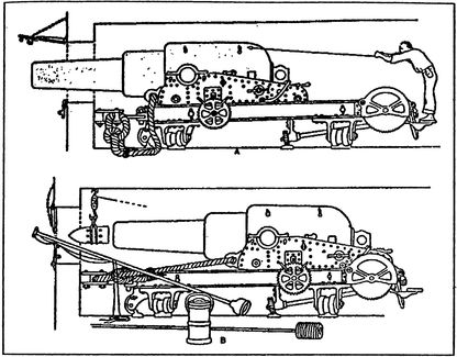 10-дм (254-мм) дульнозарядное нарезное орудие Королевского флота на горизонтально-скользящем станке с бортовым штырем на броненосце «Геркулес»: а – орудие у борта в положении ведения огня; б – орудие на полном откате в положении заряжания (к дулу подав снаряд, в отверстие закрытого порта выдвинут тыльный конец прибойника)