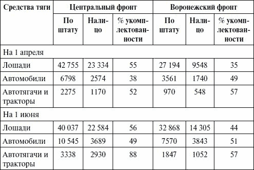 Значительно хуже обстояло с укомплектованностью артиллерии средствами тяги и транспорта. Ставка Верховного Главнокомандования не смогла повысить укомплектованность фронтов лошадьми и автотранспортом более половины штатной нормы частей. Только артиллерия Центрального фронта была обеспечена средствами механической тяги удовлетворительно. Все это снижало маневренные возможности артиллерии фронтов, тем более что из имевшихся на 1 июня в артиллерии обоих фронтов 36 889 лошадей только 17 317 были артиллерийские, остальные – обозные и верховые, что еще более ухудшало положение с подвижностью войсковой артиллерии.