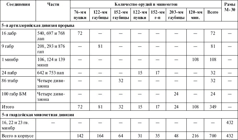 В приданном 13-й армии 4-м артиллерийском корпусе прорыва (две артиллерийские дивизии и одна дивизия гвардейских минометных частей полевой реактивной артиллерии) имелось 484 орудия, 216 минометов и 432 установки полевой реактивной артиллерии. В одном этом корпусе имелось 700 орудий и минометов от 76-мм калибра и выше, а во всей 13-й армии 752 орудия и миномета от 76-мм калибра и выше (без 82-мм минометов и 76-мм пушек ПА). Средняя плотность артиллерии армии только за счет средств корпуса увеличилась на 22 орудия и миномета и на 13,5 боевой установки на 1 км фронта.