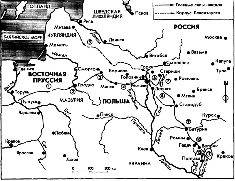 Карла же в глубине России ждала неизбежная гибель. История, как известно, не терпит сослагательного наклонения, но элементарные расчеты показывают, что Карл, двинувшись на север и соединившись с Левенгауптом, мог выбросить русских из района Невы, нанеся им огромные потери в живой силе. А дальше не было никакой нужды идти на восток, достаточно было построить мощные крепости в Орешке, Ниеншанце и Нарве, но не по канонам XIII—XIV веков, какими их брал Петр, а по образцам французских крепостей начала XVIII века, и, разумеется, оставить там сильные шведские гарнизоны.