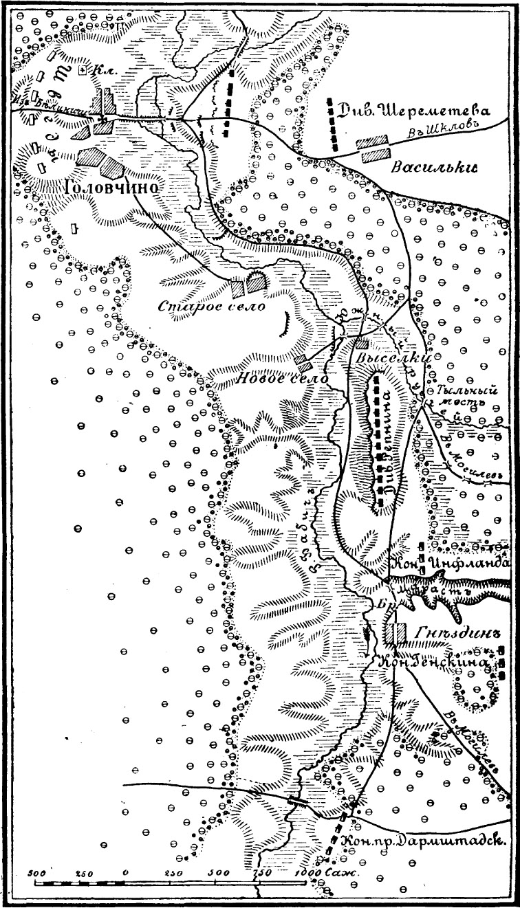 Русские возвели на позиции укрепления, причем на среднем участке они были не окончены и имели вид непрерывного окопа («транжамента») длиной более версты, с двумя фланцами под тупым углом. Линия огня правого фланга была в полверсты—версте от моста на реке Бабич, что у Выселок, а линия огня «транжамента» в 500—700 шагах от Бабича, что превосходило тогдашнюю дальность ружейного огня.