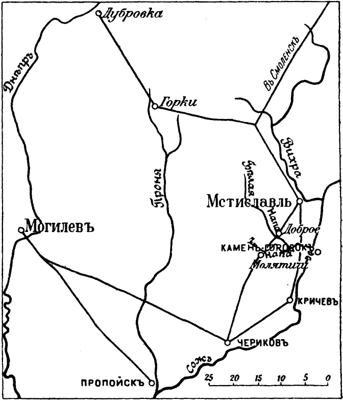 «Путь [Карла XII] лежал на восток, к тому месту, которое принято было называть “речными воротами”. (Две большие реки, Двина и Днепр, были водной преградой вдоль тогдашних русских границ, от Балтийского до Черного моря, за исключением узкого коридора, где оба водных пути сворачивают на восток: это и были “речные ворота”.) Через этот коридор шла широкая большая дорога на Москву. Хотя она не нарушалась большими реками, ее все же пересекало множество притоков. Русские предполагали использовать их как линии защиты. Их силы были разбиты на много отрядов, которые стояли наготове, чтобы остановить движение шведов. Из всех притоков самым большим была Березина, и лучшая переправа через эту реку находилась у Борисова, а следовательно, именно в этом пункте глаза рябило от оружия и выжидающих русских отрядов. Однако шведское командование предприняло искусный маневр: выбрали дорогу южнее, а в Борисов послали большой отряд конницы. Этот отвлекающий маневр заставил русских поверить, что основной удар действительно будет направлен на Борисов. А тем временем шведское войско по малым тропкам добралось до другой переправы, которая была практически не защищена. Еще раз шведское войско с минимальными потерями обошло своего противника. Однако желанного выигрыша все-таки не получилось, потому что поход, отягченный большим обозом и замедленный прескверными дорогами и прескверной погодой, проходил слишком медленно. У русских нашлось время, чтобы отступить и перегруппироваться на новой позиции за небольшой речкой Бабич у местечка Головчин»3333