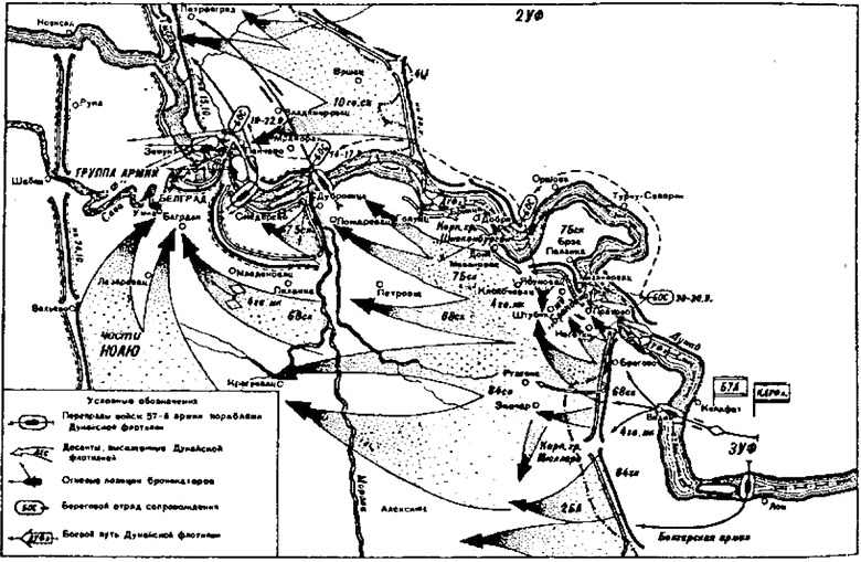 Одновременно Дунайская флотилия обеспечивала переправу войск на правый берег Дуная в районе Измаила. Только на переправах Русе – Джурджу, Калафат – Видин и Дубровица – Белград с 10 сентября по 25 октября было переправлено 55 605 человек, 130 танков, 697 орудий и минометов, 1208 автомашин, 3461 повозка, 5887 лошадей, 1203 тонн боеприпасов и других грузов.