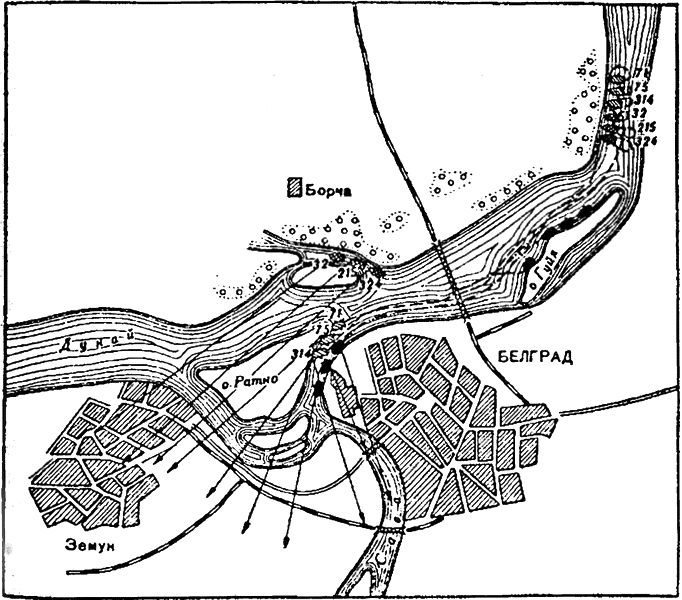 В 22 ч. 10 мин. бронекатера №№ 32, 33, 71, 75, 215, 314, 337 и 338 1-го дивизиона вышли от острова Смедеревска Ада, чтобы прорваться вверх по Дунаю для взаимодействия с приречными флангами наших войск в районе Белграда.