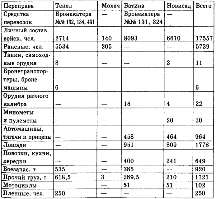 Следует заметить, что Дунайская флотилия осуществляла и обеспечивала не только воинские перевозки, но и транспортировку гражданских грузов. После освобождения Белграда Красной армией Тито обратился к Сталину с просьбой срочно обеспечить продовольствием и топливом жителей Белграда и других территорий Югославии.