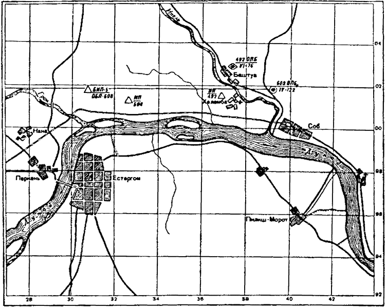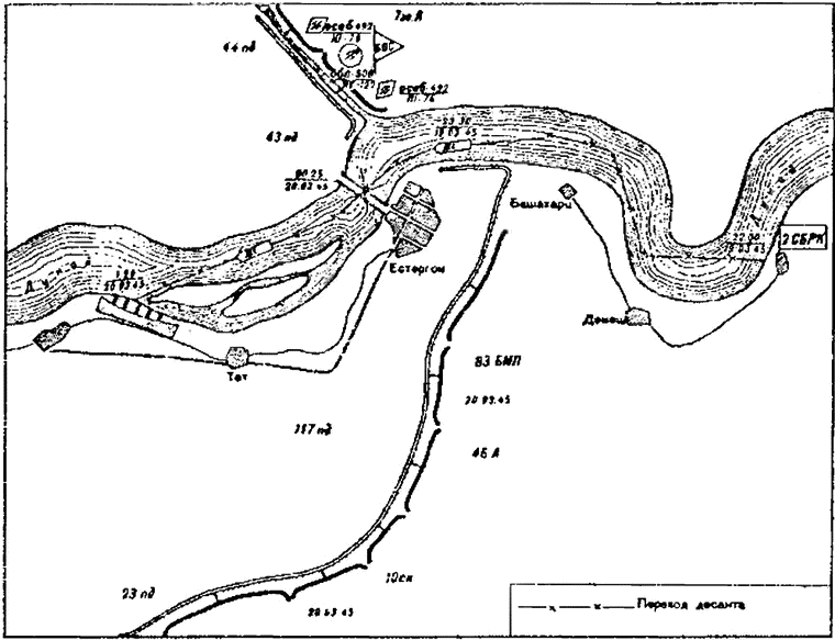 В 20 ч. 47 мин. самолеты По-2 312-й авиадивизии ночных бомбардировщиков начали бомбардировку огневых точек противника в районе Эстергом – Тат. В то же время десантные части 144-го батальона 83-й бригады морской пехоты прибыли к месту посадки на суда – на 1695 км реки.