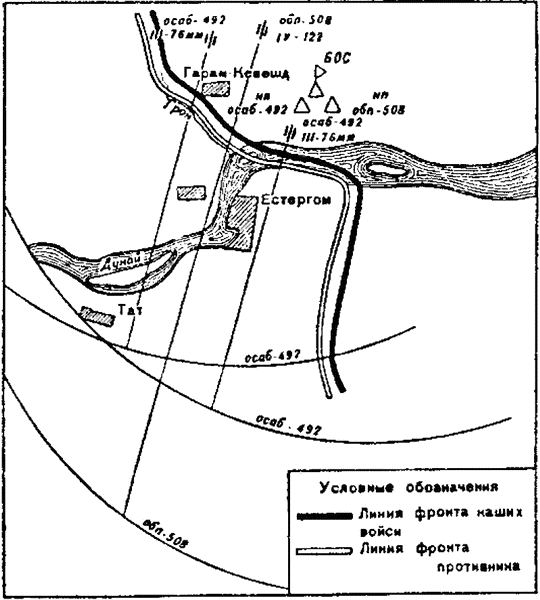 В 23 ч. 48 мин. десантный отряд подходил к эстергомскому мосту. Обеспечивая прорыв десантных кораблей через укрепленную зону противника, артиллерия 10-го стрелкового корпуса, 83-й бригады морской пехоты и Берегового отряда сопровождения флотилии начала обстреливать укрепления противника и его огневые точки.