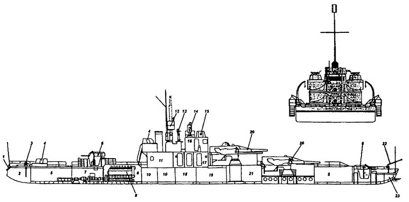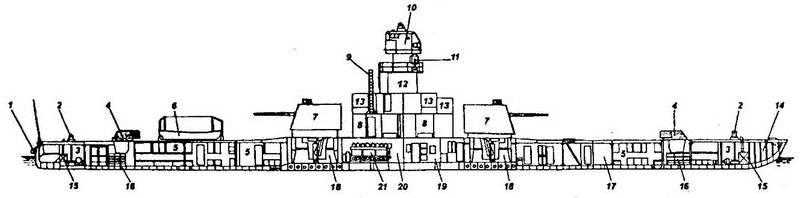 1 – кормовой якорь; 2 – ахтерпик и румпельное отделение; 3 – шпиль; 4 – счетверенная 7,62-мм пулеметная установка; 5 – кубрик команды; б – 45-мм установка 41К; 7 – отделение вспомогательных механизмов; 8 – моторное отделение; 9 – главный двигатель; 10 – каюты командного состава; 11 – отделение вспомогательного котла; 12 – телескопическая выдвижная мачта наблюдательного поста; 13 – 15-метровый зенитный дальномер; 14 – боевой прожектор; 15 – броневая рубка 2,4-метрового дальномера; 16 – боевая рубка; 17 – коридор кают командного состава; 18– камбуз; 19 – кают-компания; 20– 130-мм башенная установка В-7; 21 – погреб 130-мм выстрелов; 22 – кран-балка; 13 – форпик