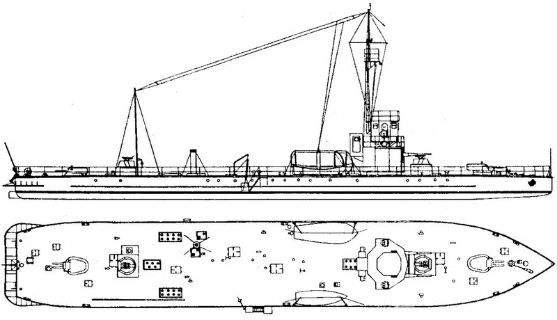 Схема внешнего вида проекта монитора для реки Дунай (С подлинных чертежей 1941 г.)