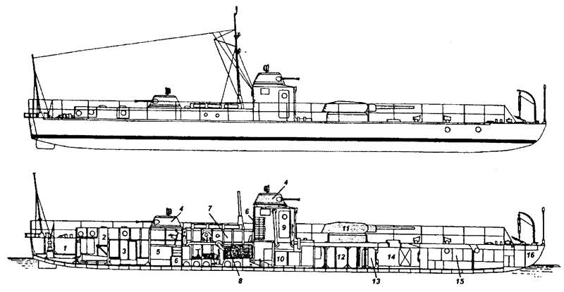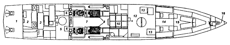 1 – ахтерпик и румпельное отделение; 2 – хозяйственный отсек и камбуз; 3 – кубик команды на 2 человека; 4– установка ДШКМ-2В; 5 – пулеметный отсек; 6 – хранилище 12,7-мм патронов; 7 – моторный отсек; подбашенное отделение; 13 – хранилище для 76-мм выстрелов; 14 – кубрик командного состава на 2 человека; 15 – кубрик команды на 6 человек; 16 – форпик