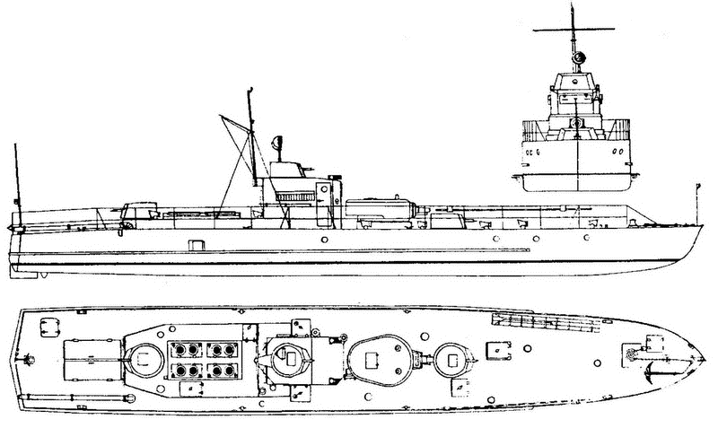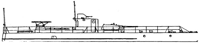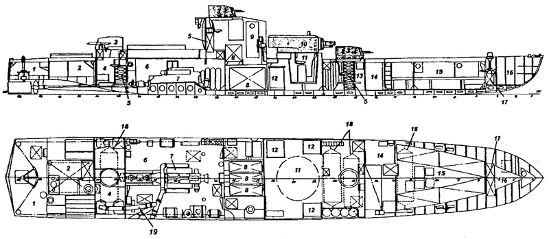 1 – ахтерпик и румпельное отделение; 2 – хозяйственный отсек и камбуз; 3 – башенка 7,62-мм пулемета; 4 – кормовой пулеметный отсек; 5 – хранилище 7,62-мм патронов; 6 – моторный отсек; 7 – главный двигатель; 8 – топливные баки; 9 – боевая (ходовая) рубка; 10 – башня от танка Т-28; 11 – подбашенное отделение от танка Т-28; 12 – хранилище 76-мм выстрелов; 13 – носовой пулеметный отсек; 14 – каюта командира корабля; 15 – кубрик команды на 6 человек; 16 – форпик; 17 – цепной ящик; 18 – подвесная койка; 19 – газовыхлопной трубопровод главного двигателя