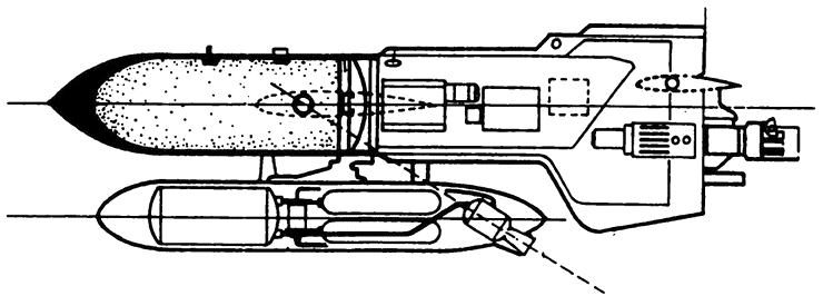 История «Щуки» выходит за рамки работы, а интересующихся я отсылаю к моей книге «Огненный меч Российского флота» (Москва: Яуза, ЭКСМО, 2004). Скажу лишь, что с некоторым приближением в комплексе «КСЩ» (корабельный самолет-снаряд «Щука») роль торпеды выполняла боевая часть, а торпедоносцем являлась сама ракета. Ракета приводнялась примерно в 60 м от цели, и дальше боевая часть шла под водой на глубине от 2 до 7 м к борту вражеского корабля.