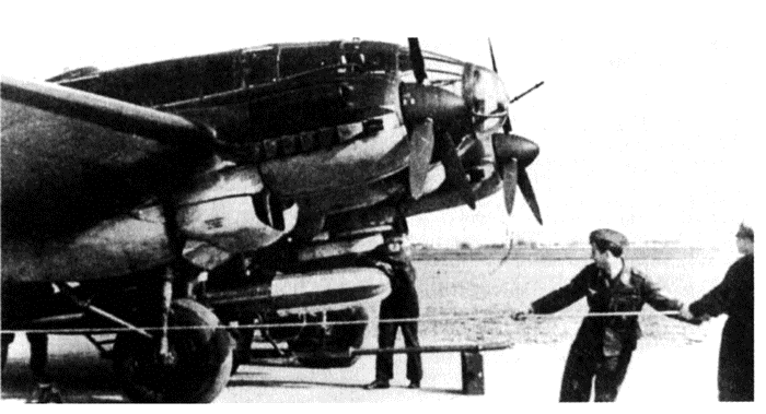 Носовой стрелок бомбардировщика Не-111 ведет огонь