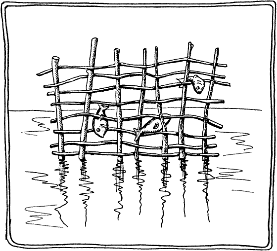 Представьте себе, что вы захотели поймать рыбу, резвящуюся на залитых полях. Проще всего натыкать веток, и, когда вода спадет, рыба застрянет. Но хитрая рыба очень плоская и проскакивает между ветками. Тогда проще всего закрепить эти ветки ветками поперек. Чтобы они держались, пропускать поперечные ветки их с двух сторон между воткнутыми. Это сделает любой и каждый, не зная даже, как выглядит плетень. Так возник первый в мире плетень [рис. 32].