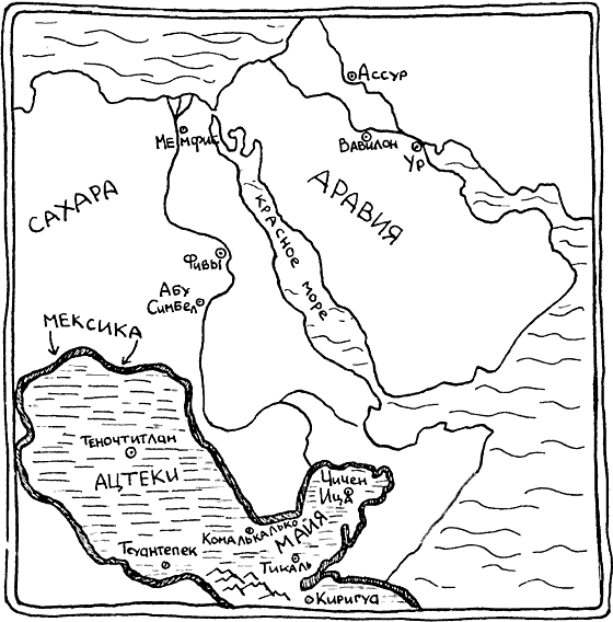У индейцев в Америке не было изобретено колесо, а значит и не были придуманы механизмы, которые не работают без колеса. Почему это произошло, можно только гадать. Скорее всего, это связано с тем, что территория цивилизации южной Мексики несравнимо меньше, чем пустыни Сахара и Аравийская пустыня вместе [рис. 48]. Это означает гораздо большее разнообразие людей, их привычек и поступков. Некоторые из этих привычек стали краеугольными в развитии цивилизации.