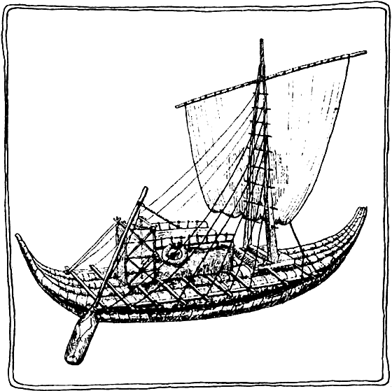 Удивительно, но форма лодки сохранилась у жителей Средиземного моря сначала у финикийцев, потом у греков [рис. 54] точно такой же, как была у египтян. Папирус там не рос, и лодки воспроизводили один к одному как у египтян, только из дерева. Отсюда и высокий нос у греческих галер, русских ладей [рис. 55] и кораблей викингов.
