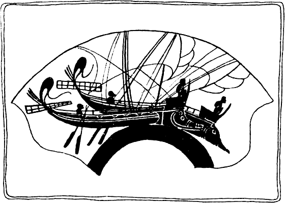 Рис. 54. Древнегреческий рисунок лодки с высоким носом. Можно сравнить с египетской из папируса рис. 51