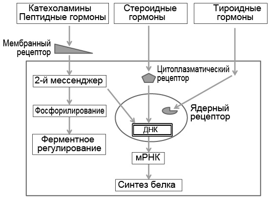 Стероидные гормоны липофильны, поэтому свободно диффундируют через клеточную мембрану, а затем связываются с цитозольными рецепторными белками. Образовавшийся комплекс «стероидный гормон – рецептор» перемещается в ядро клетки, где он обратимо связывается с геном, изменяет ДНК, что модулирует транскрипцию матричной рибонуклеиновой кислоты (РНК).